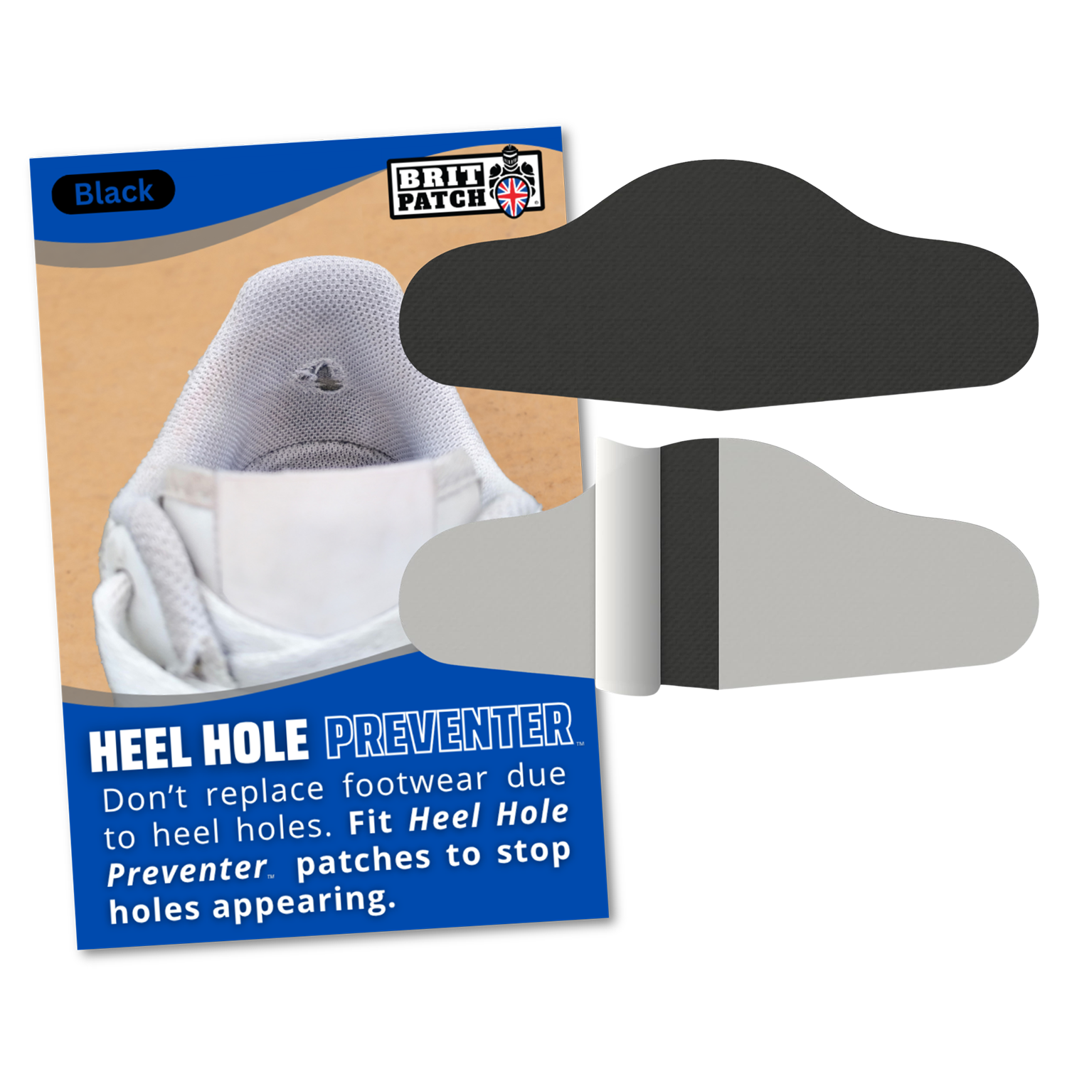 The Brit Patch Heel Hole Preventer is a practical, durable solution designed to protect the heel area of your footwear from wear and tear caused by rubbing and friction. Ideal for trainers, running shoes, and everyday fabric footwear, these wrap-around self-adhesive patches reinforce the heel to help prevent holes from forming and extend the life of your shoes. Once fitted, the patches sit smoothly inside the heel and remain discreet during wear.